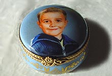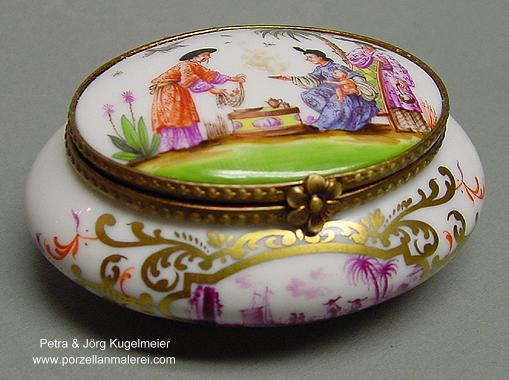 very personal gift! Finest portraiture on a small pill-can. The color-surfaces are hand-made. That lower part is embellished with a fine burnish-gold-border. Size: 2 in. |