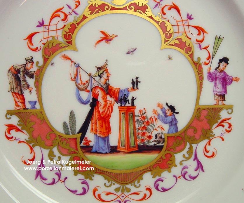 oval Chinoiseries after J.G.Höroldt, on rich gold rocaille, with purple - Chinese-landscape in the framed sign, on front - and rear. Size: 2 1/4 in |