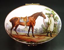 horse-portrait! Can with one " horse and Rider " shape in finest copper-engraving-manner . Tender blooms supple adorn that lower part of the can. Size: H. 1 1/4 in., W. 3 in., D. 2 in. |