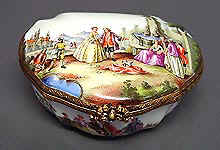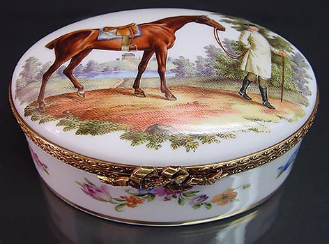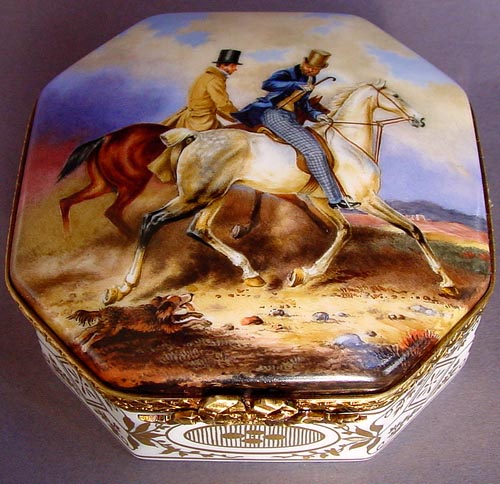 8 angular " The ride of the prince Wilhelm" after F.Krüger, the motive of the cover-part is . That lower part is embellished with a rich gold-ornament. Size: H. 1 1/4 in. cm, W. 3 1/4 in., D. 3 1/4 in. |