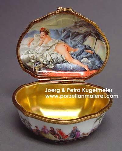 valuable pieces. On the lower part one circulation-finishes Watteau-scene, just as on the underside. The inside of the cover presents the erotically ,sensual representation "Louise O´Murphy" of F.Boucher. Massif-gold encloses tender blooms in the underside of the can. Size: 2,5 in. |