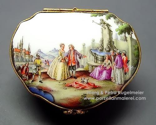 Finest magnifiing glass painting on a small pill-box. Monochrom painting in Sepia. The scene of the lid is framed with a fine engraving matt gold Without magnifiing glasses painting. Size: 1 1/4 in. |