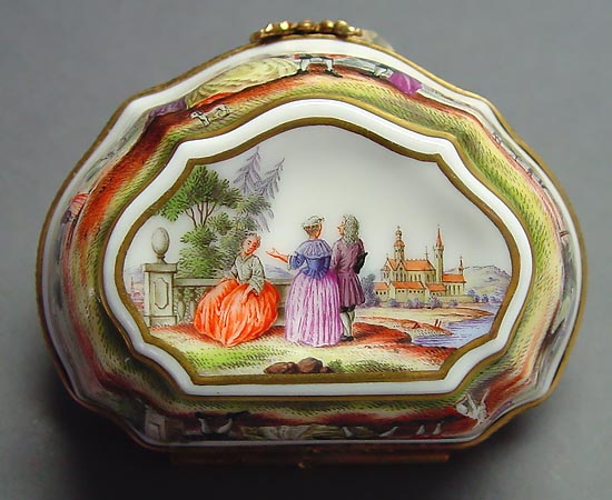 Sea landscape after C.J.Vernet on the canned-cover. " Harbor-opinion in the morning ", in a rich edge with burnish-gold embellished. Lower part, with florals and insects after Maria, Sybilla Merian and small gold-roccaillen. Size: H. 1 1/2 in. ,W. 3 1/4 in. ,D. 3 in. |